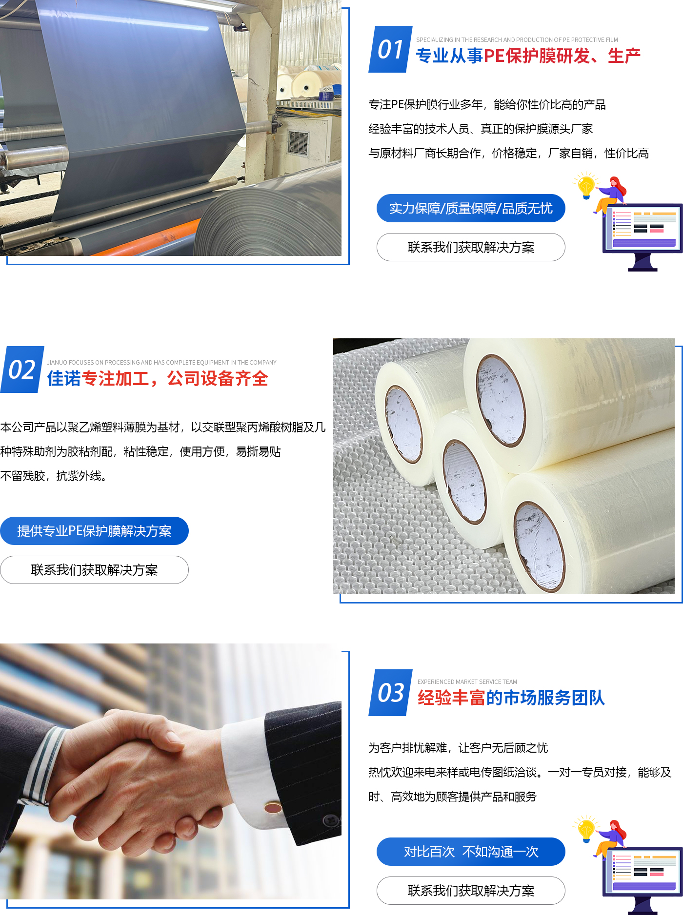 德州佳諾塑業(yè)有限公司生產防靜電自粘膜,包裝膜,筒子膜,原模,各種PE保護膜以及保護膜基材。公司生產保護膜、膠帶,是各類不銹鋼板、彩鋼板、鋁塑板、防火板、塑鋼型材、裝飾板、有機玻璃制品、漆面板、鏡面板、外墻板,保溫板,石英石,大理石,人造石,瓷磚,防盜門,木門,不銹鋼門窗,各種裝飾面板,各種建筑板材、地毯,以及電子、家用電器、家具、汽車制造,等行業(yè)不可缺少的表面保護材料。使被貼物在運輸、加工、貯存和使用過程中不受污染、腐蝕、劃傷,保護原有的光潔亮澤的表面,從而提高產品質量。 本公司產品用于鋁型材,PVC等材質型材保護膜,鋁門等鋁制品保護膜,鋁塑板,不繡鋼,鋁合金等產品表面保護膜,保護其在運輸途中,生產,安裝時對產品表面所造成的刮傷,灰塵等。可用于,汽車門,木地板,冰箱表面等家電及電子產品表面的保護。 基材:PE材質 粘性:低粘,中粘,高粘,特高粘 膜材:透明膜,藍膜,黑白膜,乳白膜 ( 除藍膜外,其...